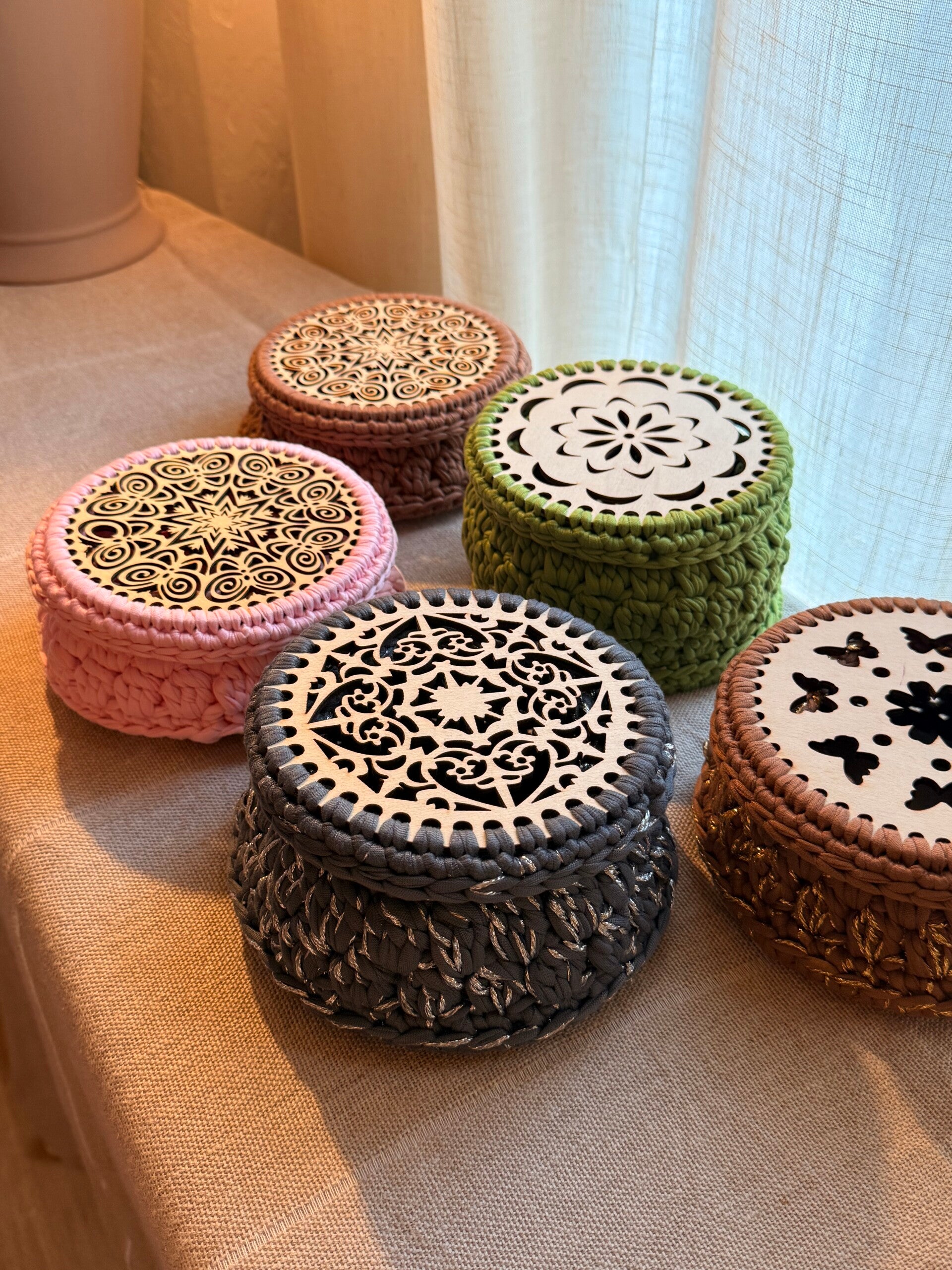Je suis une passionnée des boites. De toutes sortes et de toutes les couleurs, j'en possède de nombreuses quantités. Que ce soit pour contenir mes accessoires de coiffure, mes boutons de réserve, ou pour vider mes poches sur le meuble d'entrée. J'ai décidé d'en créer au crochet et en bois, et je suis contente de voir que vous avez été nombreux à aimer ce produit. C'est pour cela que je continue cette année avec de nouvelles formes et de nouvelles couleurs. Bientôt sur la boutique ;)